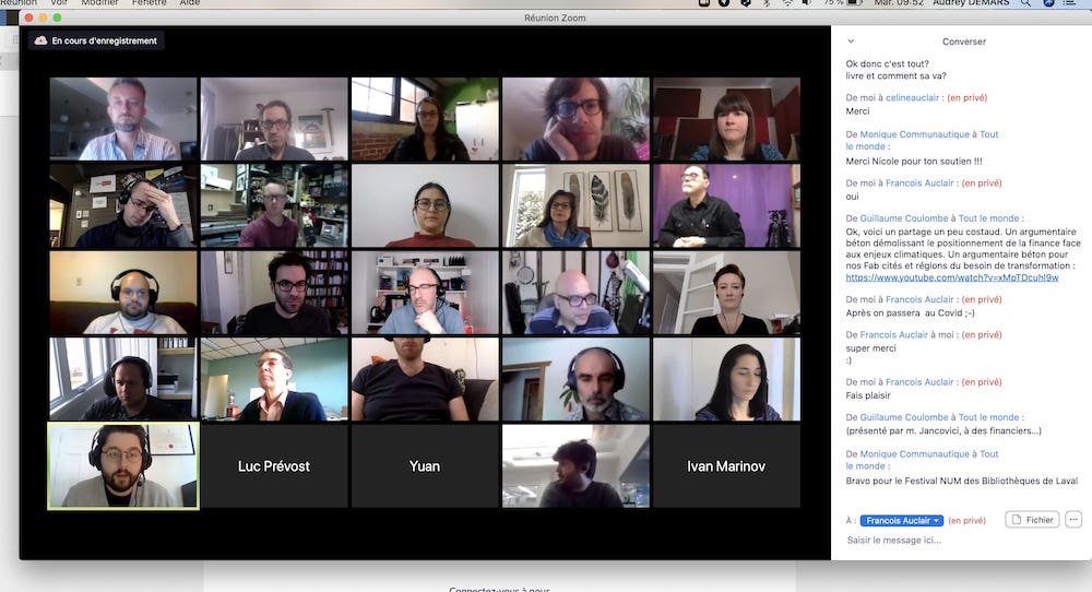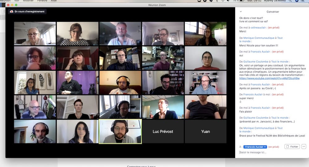 Pour se rencontrer, un canal JitSi (plateforme de téléprésence ouverte) : meet.jit.si/fablabs-québec. Il est bienvenu de s’annoncer dans le canal Telegram la veille.